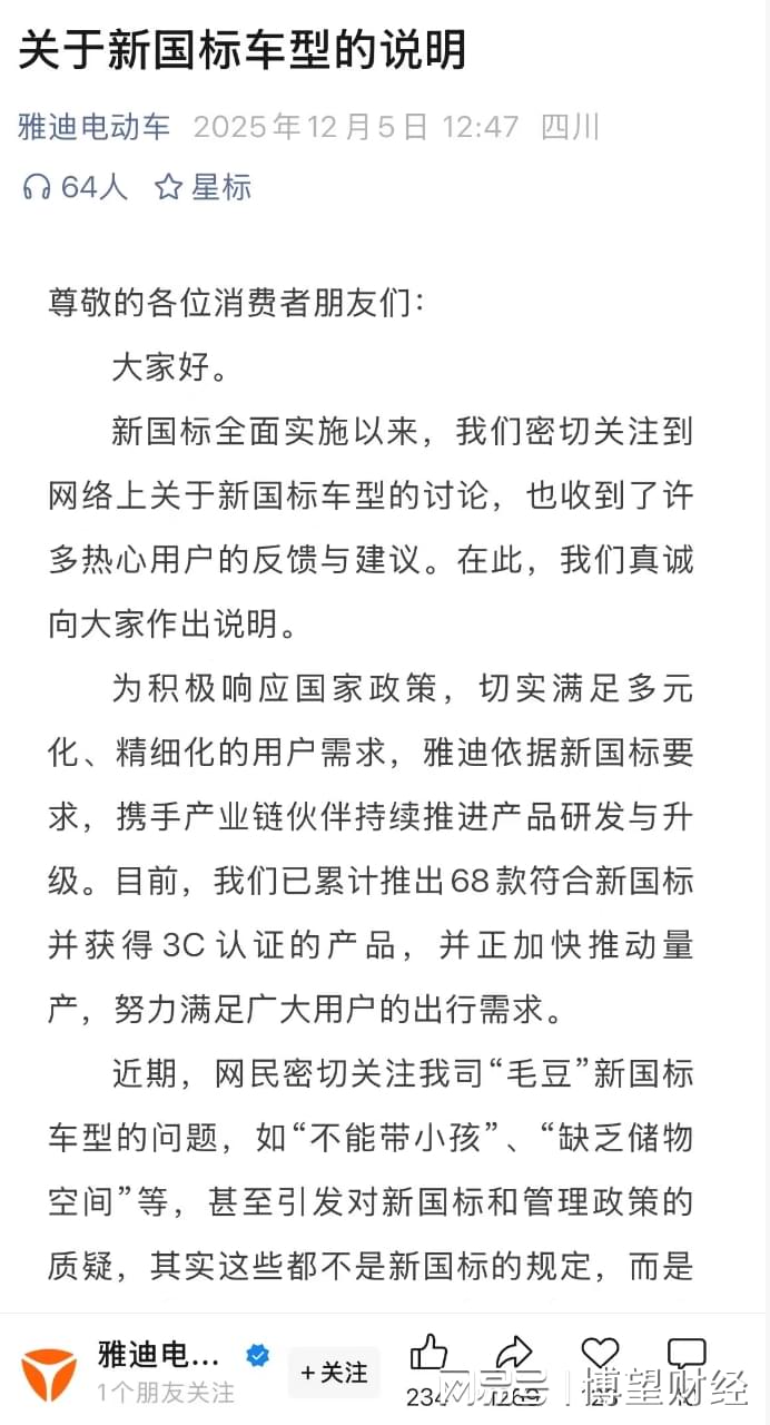 在官方定调后,雅迪于12月4日发布《关于积极落实电动自行车新国标的声明》,表示网传对新国标车型的质疑是对标准条款执行的误读和错误理解,但并没有提到被消费者疯狂吐槽的“毛豆”车型问题。显然消费者并不买账,随后雅迪发布《关于新国标车型的说明》,正式道歉。