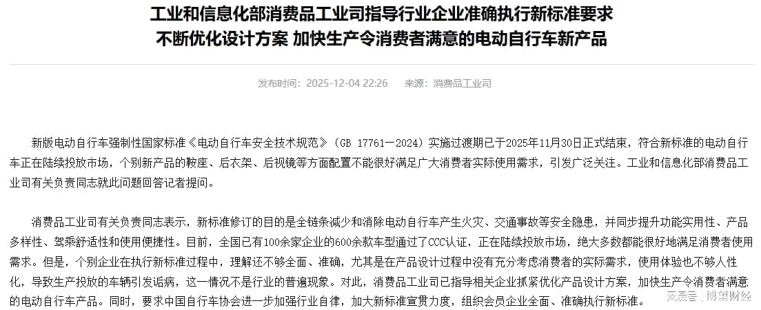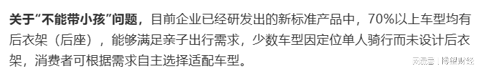 舆论持续发酵后,2025年12月4日中国自行车协会指出,“个别企业对新标准产品的生产准备不充分、宣传解释不到位,造成有些网民的误读误解”。协会强调,70%以上的新国标车型设计有后衣架,能够满足亲子出行需求。