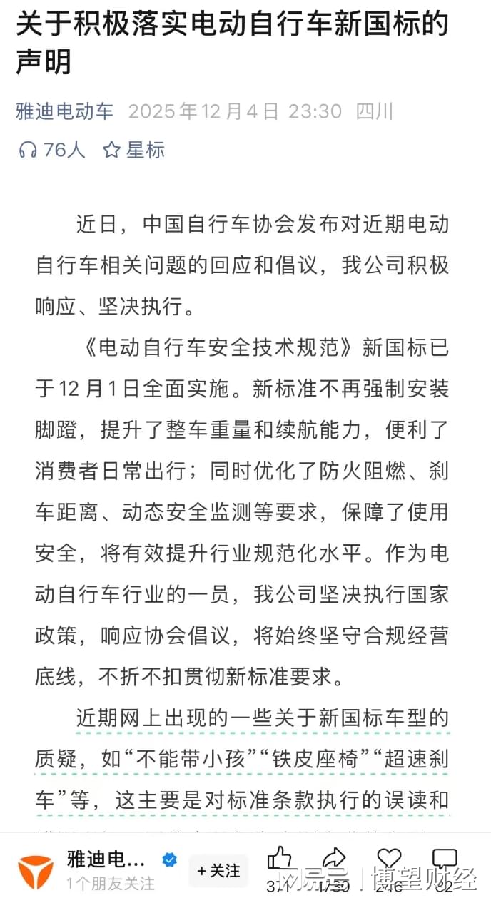 2025年12月1日,电动自行车新国标(GB 17761—2024)正式全面实施,过渡期结束。此后几天,雅迪新推出的“毛豆”车型引发消费者强烈不满。