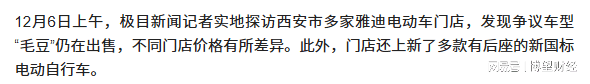 但据《极目新闻》报道,2025年12月6日,在西安市多家雅迪电动车门店内,“毛豆”车型仍在出售,不同门店价格有所差异。此外,门店还上新了多款有后座的新国标电动自行车。