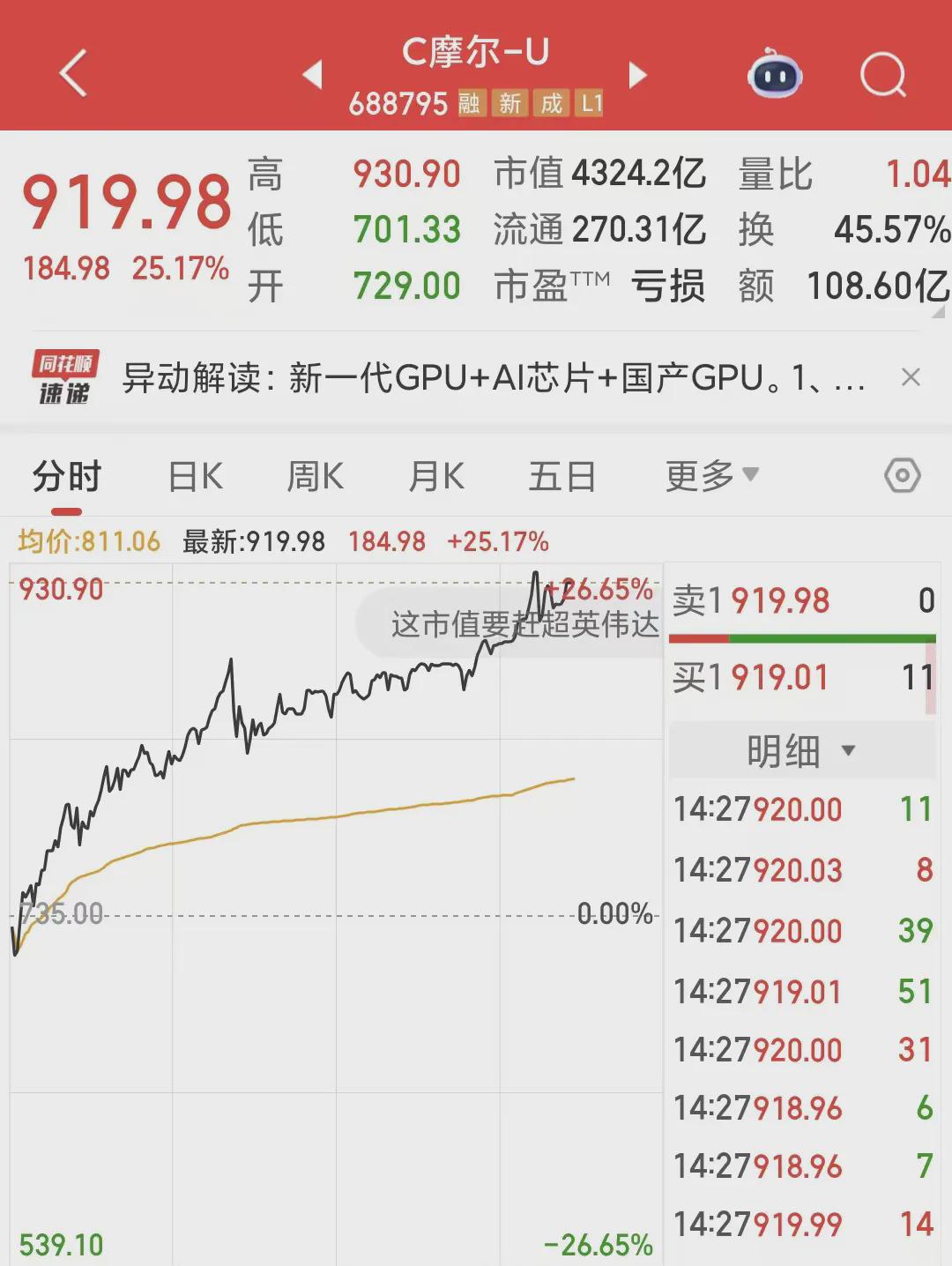 12月11日,摩尔线程的股价延续了前几日的上涨趋势再创新高,截至发文前股价上涨25.17%,来到919.98元/股,市值为4324.2亿。