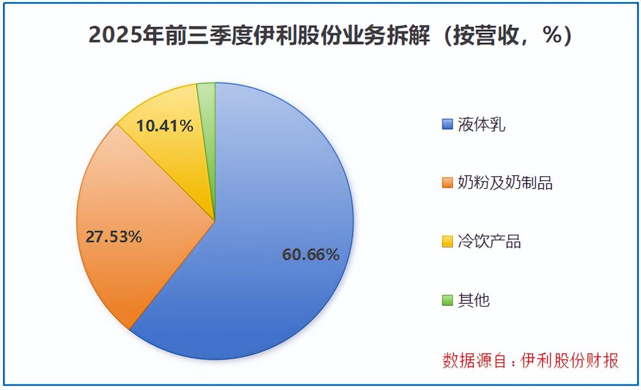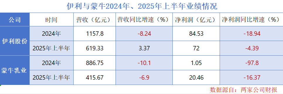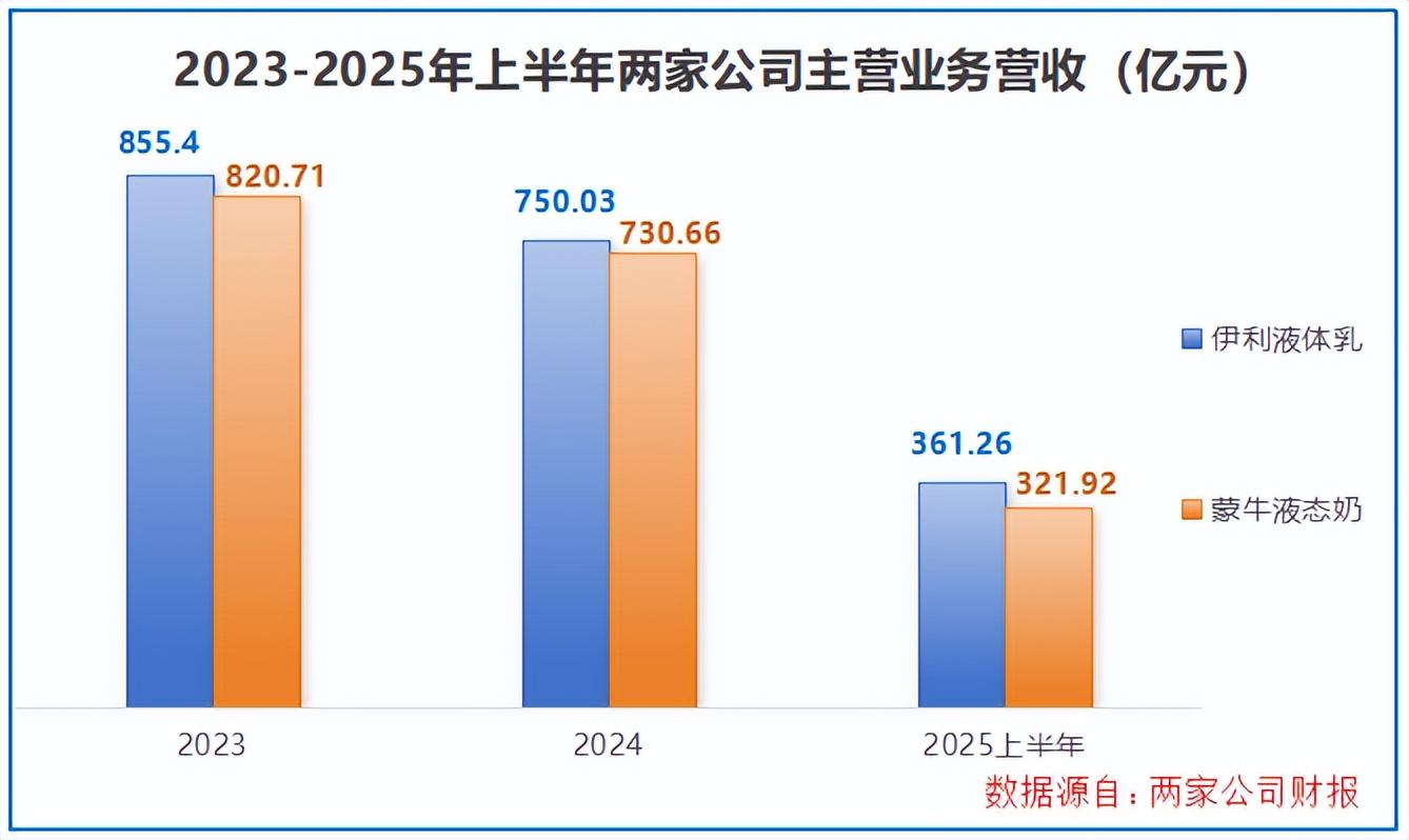 2024年,伊利液体乳营收从2023年的855亿元降至750亿元,同比下滑超100亿元;蒙牛液态奶收入也从821亿元缩水至731亿元,直接拉低了整体营收水平。