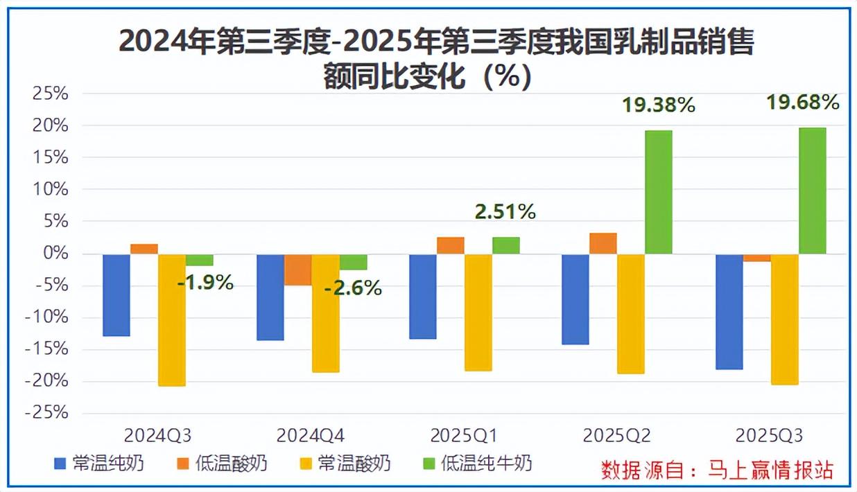 2025年第一季度,我国常温纯牛奶销售额同比下降13.44%,而低温纯牛奶销售额逆势增长2.51%,成为乳业市场中少有的增长亮点。