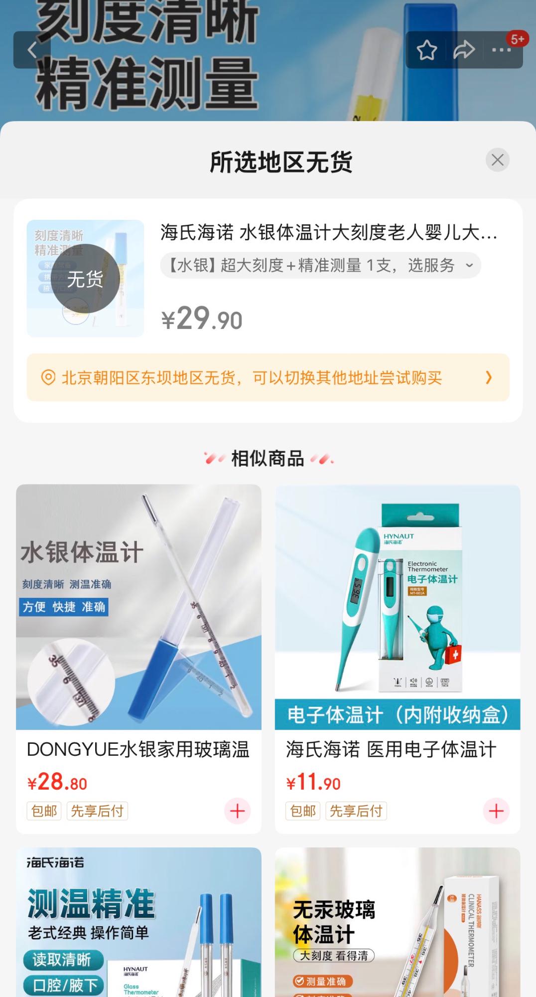 在淘宝平台,时代周报记者发现,阿里健康大药房和天猫超市中有多款水银体温计产品显示商品已卖光,也有多款产品进入界面后发现只有电子体温计可以购买,还有货的部分商家售价多在每支15元以上。