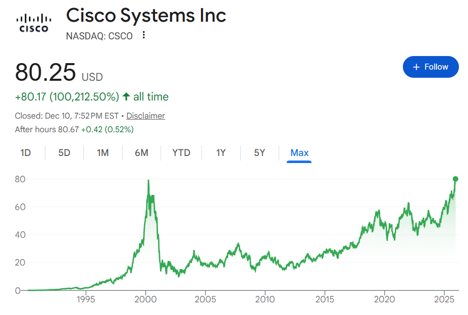 在上世纪90年代末的互联网泡沫时期,随着互联网基础设施需求的飙升,网络硬件制造商思科一跃成为全球最有价值的公司之一。然而,当泡沫破裂后,对新设备的需求骤降,思科的股价也暴跌了超过85%。