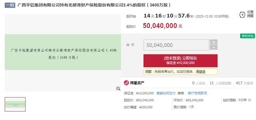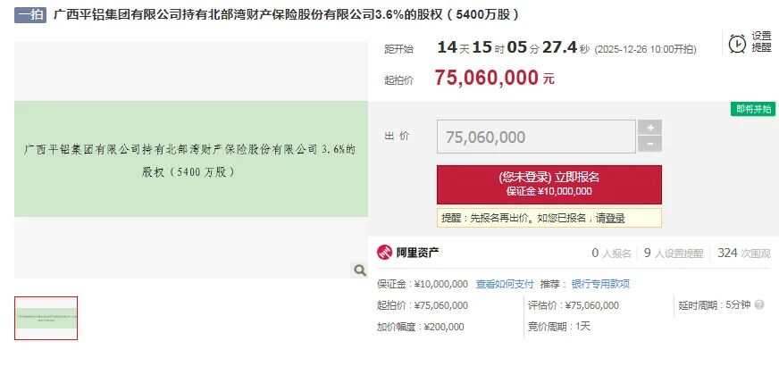 拍卖信息显示,该笔股权将被拆分为两笔进行拍卖。其中,5400万股起拍价0.75亿元,3600万股起拍价0.50亿元,合计起拍价1.25亿元。若顺利找到接盘方,广西平铝集团将彻底退出北部湾财险股东行列。