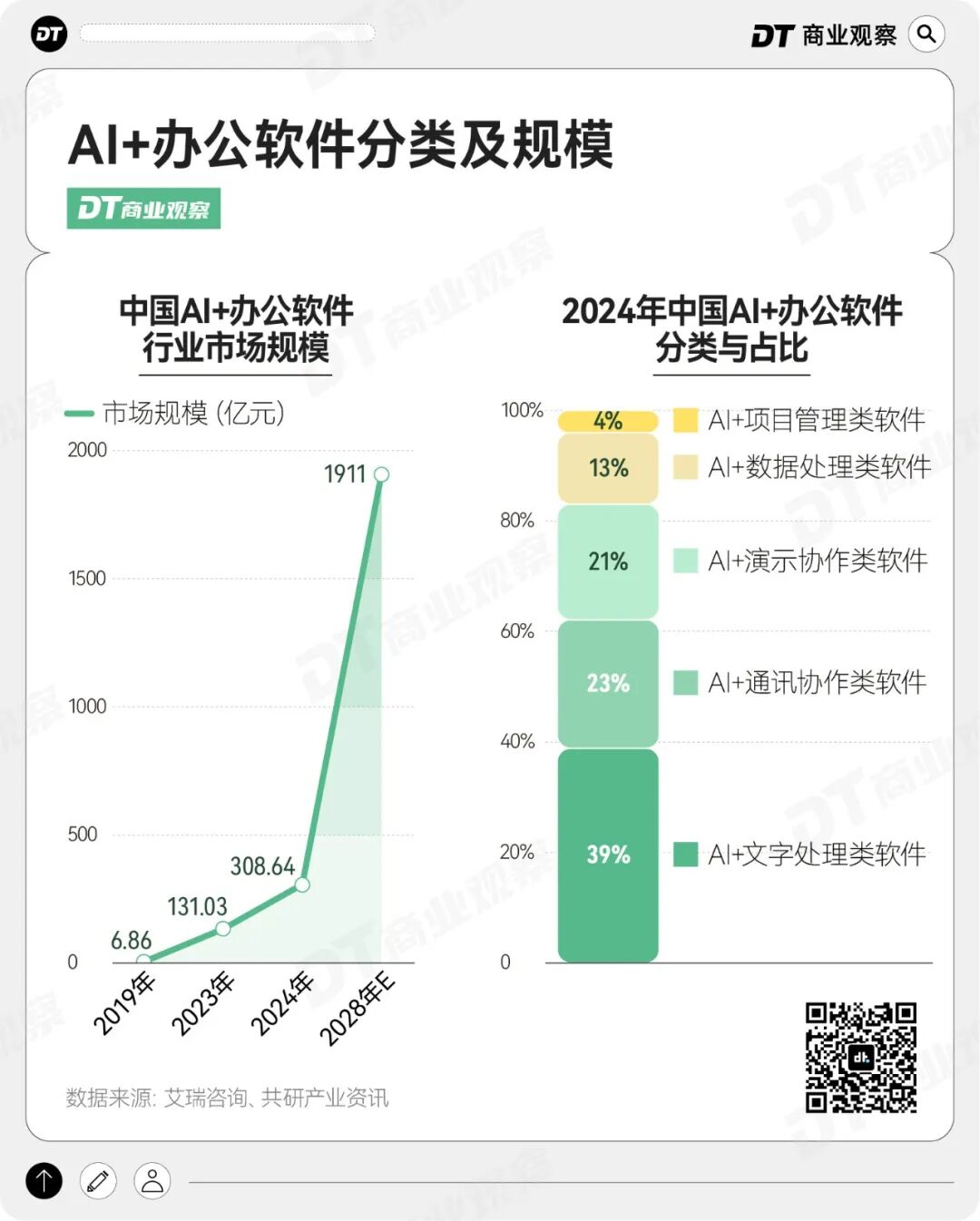 强需求拉动下,2024年AI办公软件的市场规模预估达308.64亿元,其中,AI+PPT占比约21%,到2028年,AI办公软件 的规模预计将突破1911亿元。