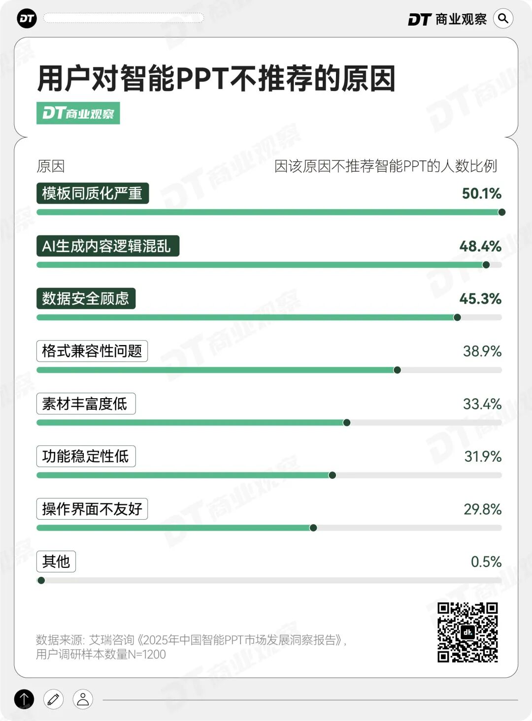 艾瑞咨询的最新调研显示,智能PPT模板同质化严重(50.1%)、AI生成内容逻辑混乱(48.4%)、数据安全情况的顾虑(45.3%)已经成为相关产品的共性问题,这直接导致了现阶段用户对于智能PPT的推荐意愿仅处于中等偏上水平。