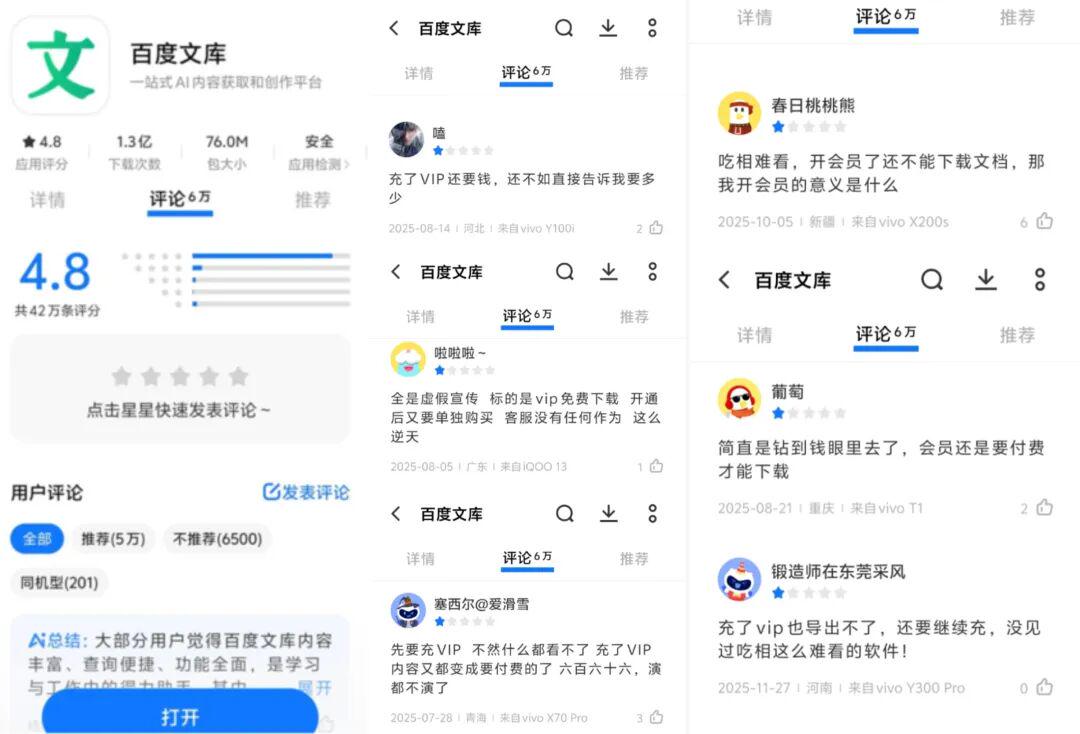 除此之外,百度文库应用商城中的高分推荐中也夹杂了不少吐槽。在安卓端应用商城,百度文库累计下载次数为1.3亿,应用评分4.8(满分5),现有6万条用户评价里,推荐与不推荐比例约为7.69:1;IOS端情况(4.7分,满分5分)与安卓端相差不大。
