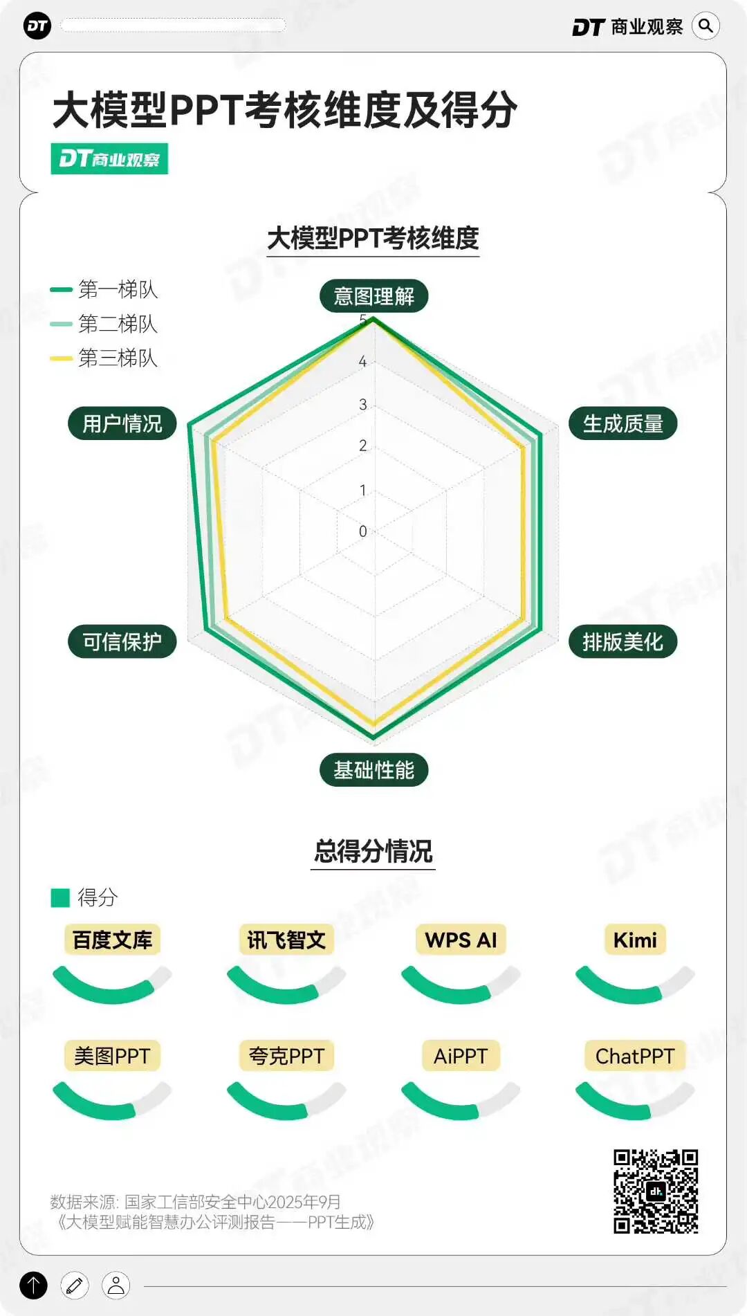 DT关注到,今年10月,百度文库APP月活位居国内AI应用榜第8名,是唯一一位以AI内容创作功能登榜TOP10的。与此同期,在工信部发布的《大模型赋能智慧办公测评报告—PPT生成》中,百度文库综合得分及多项细分指标排名第一。