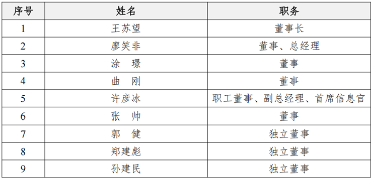 简历显示,王望苏曾任中信证券投资银行部职员,招商证券投资银行总部战略客户部总经理、投资银行总部副总经理。廖笑非曾任国投证券投资银行业务委员会主任兼股权融资总部总经理。