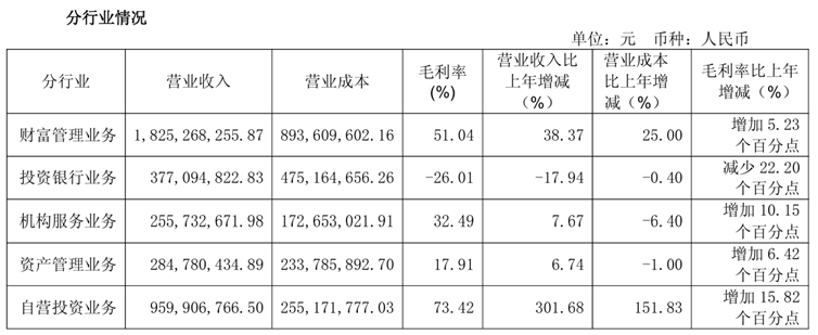 国金证券业绩快速增长,更大的推动力来源于自营业务。今年上半年,财富管理业务收入为18.25亿元,同比增长38.37%;自营业务收入为9.60亿元,同比增长301.68%。