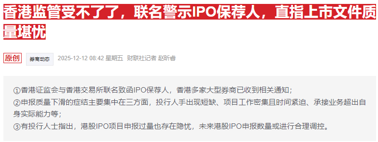 据报道,香港证监会与香港交易所联合于上周五联名致函IPO保荐人,针对近期新上市申请中出现的质量下滑及部分不合规行为表达明确关切。值得注意的是,尽管港交所与香港证监会曾在2024年10月联合发布声明,明确上市文件质素标准,但此次“联合致函”是双方首次以该形式强化上市申请审核监管。