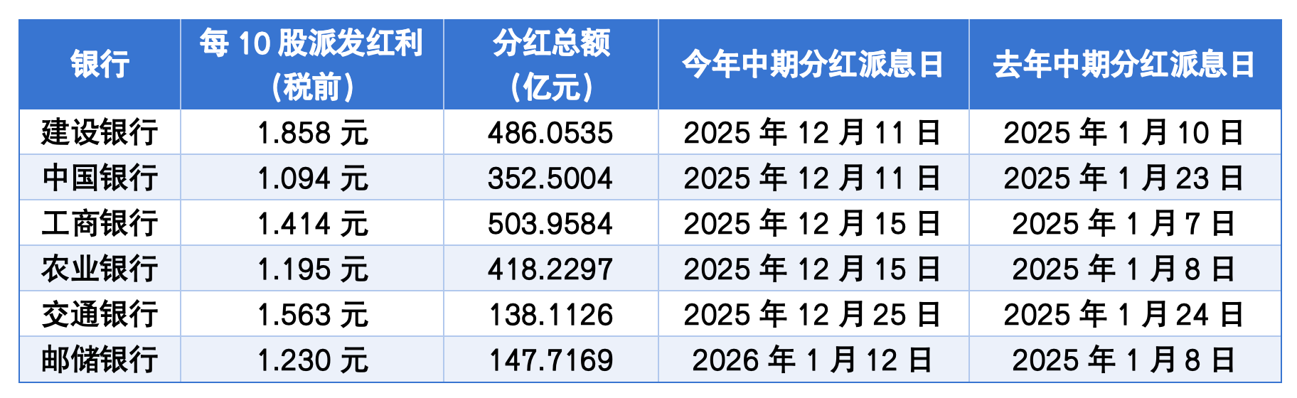 国有大行“红包雨”来临!12月12日晚,交通银行发布公告称,该行将按照普通股每股派发0.1563元(含税)派发2025年中期现金股息,A股派息日预计为2025年12月25日。在此之前,中国银行与建设银行已经于12月11日完成中期A股分红发放;工商银行和农业银行则公告定于12月15日分红派息;邮储银行则拟于2026年1月12日分红派息,相关方案仍有待本月召开的临时股东大会审议通过。