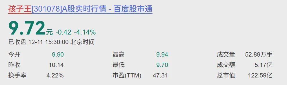 2021年10月,孩子王在深交所创业板上市。截至最近,股价徘徊在9.72元左右,市值约122亿元。