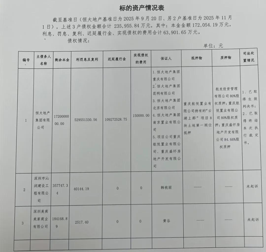 据民生银行深圳分行此前披露的竞买公告,该行对恒大地产集团有限公司、深圳市沁润建设工程有限公司、深圳美商美家商业有限公司三户债权进行公开挂牌竞价转让。截至转让基准日(恒大地产集团有限公司基准日为2025年9月20日、另2户基准日为2025年11月1日),3户债权金额合计235,955.84万元,债权本金余额172,054.19万元。