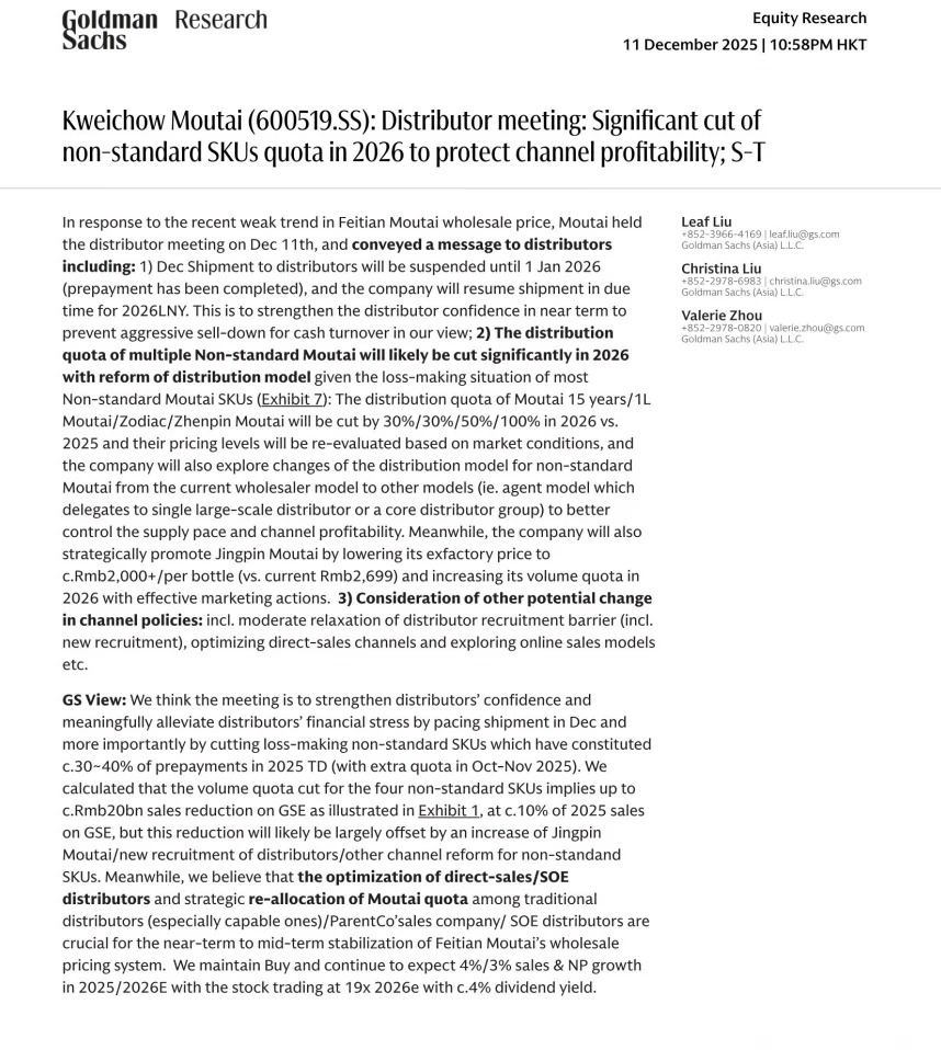 一、按下“暂停键”:12月暂停发货为了防止年底经销商为了回笼资金而低价抛售(即我们常说的“杀跌”),茅台祭出了短期大招:12月发货全面暂停,直至2026年1月1日。虽然预付款已经完成,但货先压着不发。此举旨在给渠道“减负”,通过控制供给侧来稳住短期信心,避免市场出现恐慌性抛售。