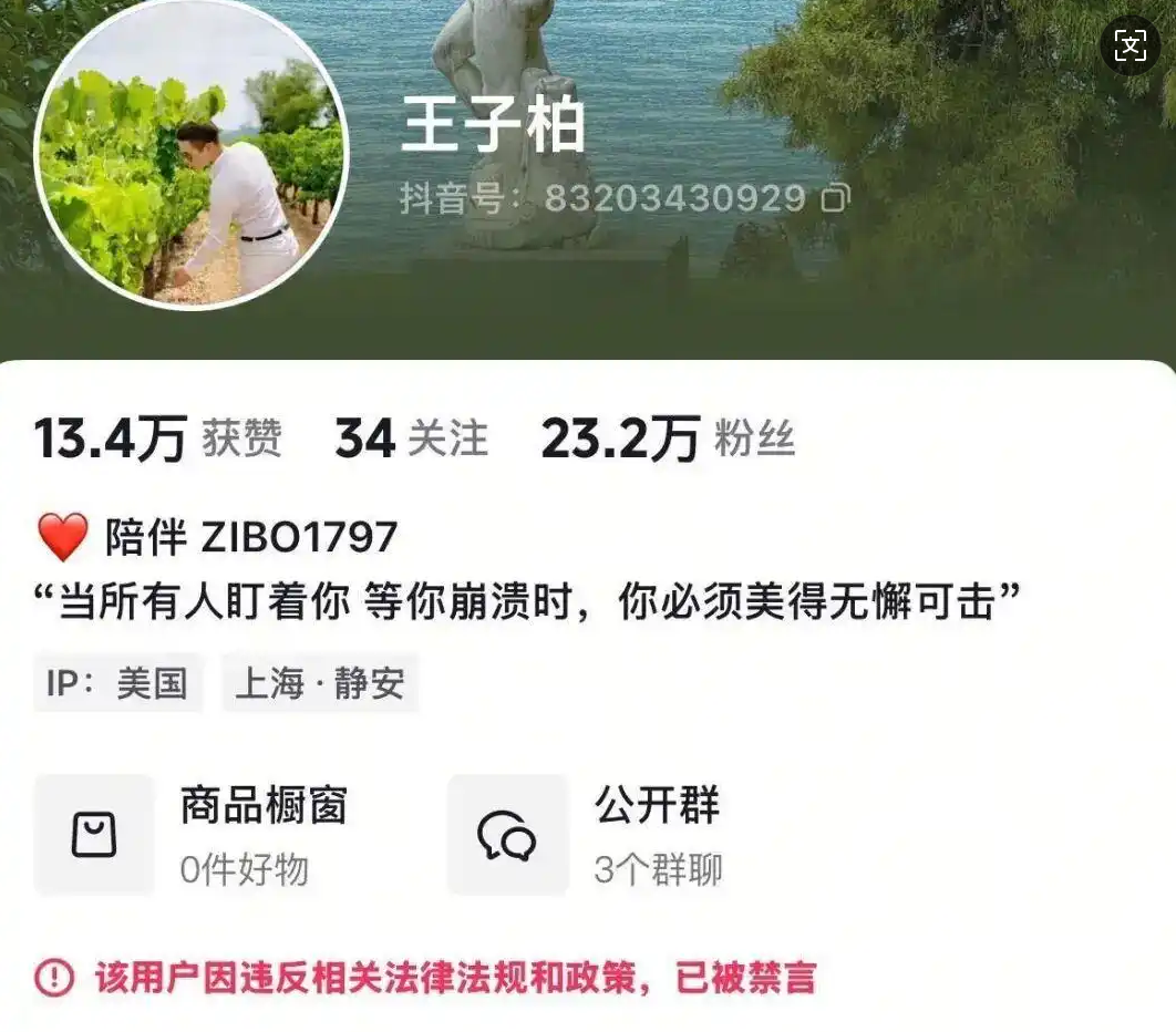 据极目新闻、大河报,曾因频繁“炫富”遭封号,并因偷税749万元被处以1330万罚款的网红“柏公子”,以“王子柏”账号在社交平台复出,11月已直播超19次。账号显示,目前他的地理位置显示在美国,粉丝数已达23万。11月24日晚,该账号已无法查看到直播动态,主页显示“该用户因违反相关法律法规和政策,已被禁言”。