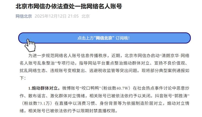 据多家媒体报道,昨日(12月12日),北京市网信办启动“清朗京华·网络名人账号乱象整治”行动,通报了一大批网络名人账号违规被封禁案例,特别提到了几位千万级粉丝的劣迹大网红,他们借小号等变相复出被查,包括“东北雨姐”“猫一杯”“秀才”等人。