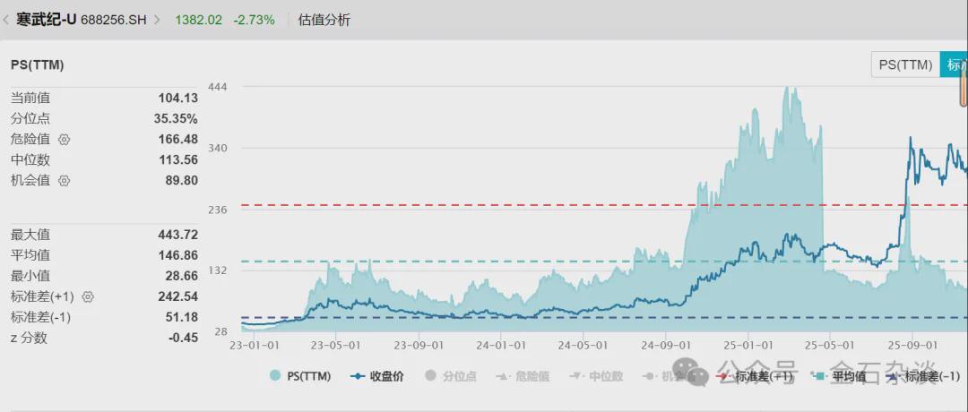 那一直有着“市概率来估值”说法的寒武纪,市销率又有多少呢?根据wind数据,寒武纪市销率104倍,最高也就是444倍,不及摩尔的1/2。目前市销率更是只有摩尔的1/10。