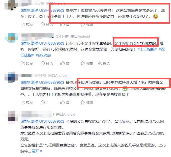股民们纷纷冷嘲热讽: 摩尔才上市就拿75亿去理财! 这家公司简直是太奇葩了,现在上市了,员工个个身价上千万,你说哪还有奋斗的动力,还研发什么GPU了。