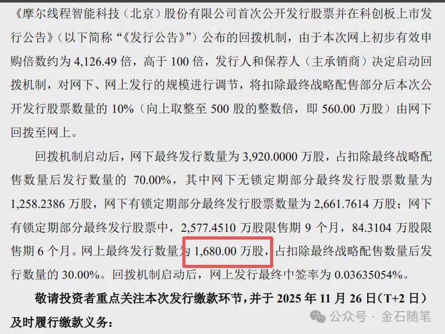金石杂谈统计发现,摩尔上市前股东有4亿股,禁售;本次发行7000万股,战略配售1400万股;有触发 回拨机制 ,网上配售1680万股,中签率低至0.036%;网下配售3920万,各大公募、私募(包括量化)、保险、券商、资管挤破头杀入。