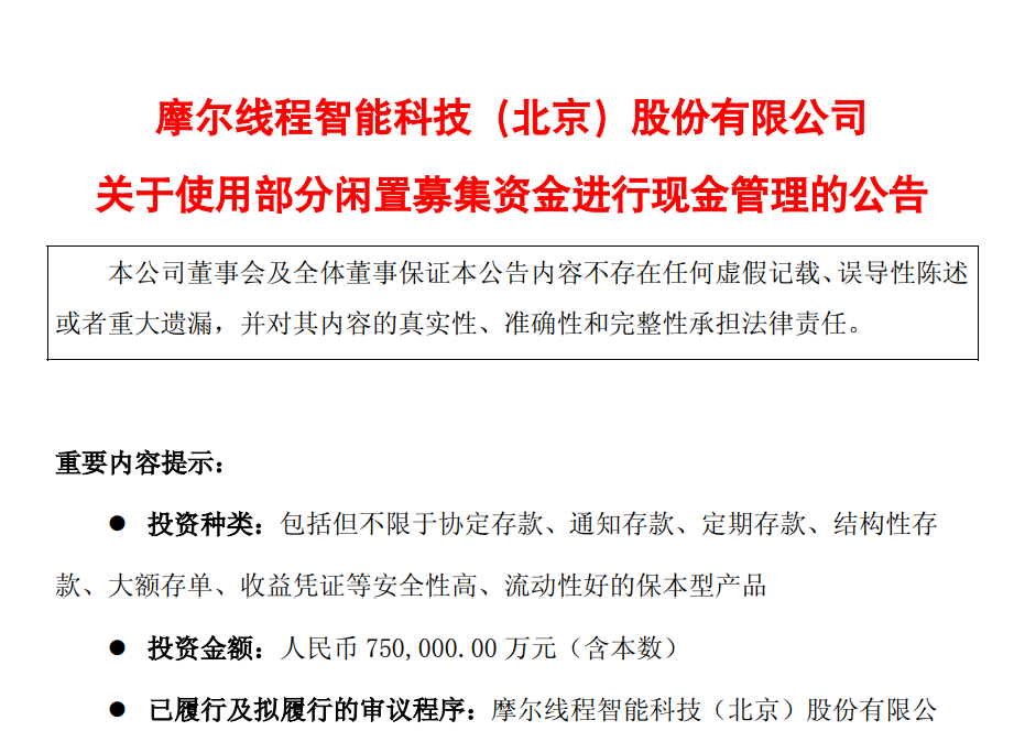 根据摩尔线程配售结果,摩尔发行价114.28元,发行7000万股,募资额不到80亿元,刚刚上市6天,就紧急把75亿拿去买理财了。