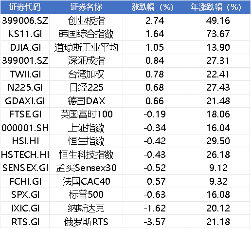 本周国内重磅会议召开、美联储鸽派降息25bp,但甲骨文、博通财报加剧了市场对AI泡沫的担忧,全球股市涨跌各半。创业板指本周大涨2.74%领涨全球,美股则出现分化,道指涨超1%,纳指下跌1.62%。