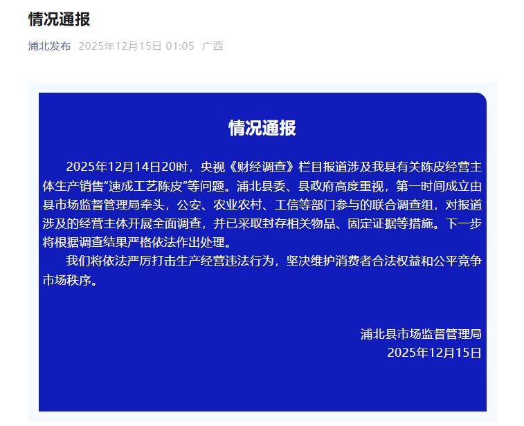 中新经纬12月15日电 “浦北发布”微信号15日凌晨发布情况通报,回应央视报道当地生产销售“速成工艺陈皮”等表示,第一时间成立联合调查组,对报道涉及的经营主体开展全面调查。