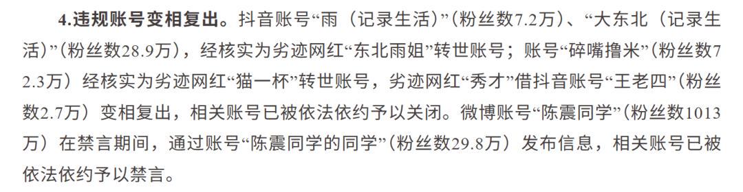 在官方通报的部分典型案例中,官方点名了知名车评人陈震。官方指出微博账号“陈震同学”(粉丝数1013万)在禁言期间,通过账号“陈震同学的同学”(粉丝数29.8万)发布信息,相关账号已被依法依约予以禁言。