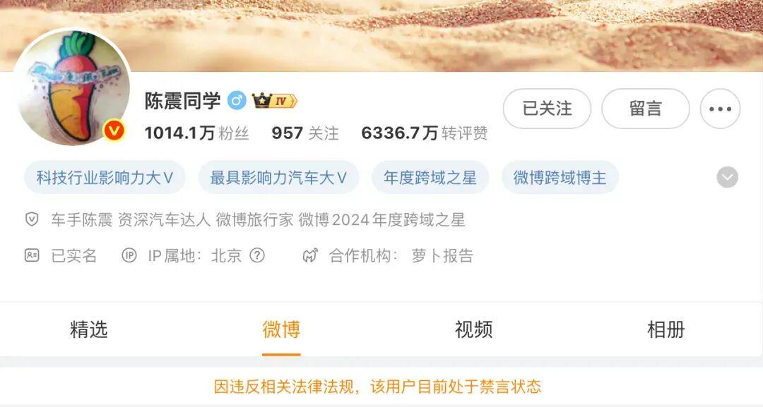 12月4日,陈震因违反相关法律法规和政策,在抖音、快手、小红书、微博平台显示被禁言,其b站显示账号已被封禁。彼时,该信息也引发了广大网友的热议。12月5日,陈震通过小号@陈震同学的同学 发文回应全网封禁事件。其表示,“没啥可说的,反思自己”。不过在其小号发布不久后,又再次被封,相关视频也被删除。