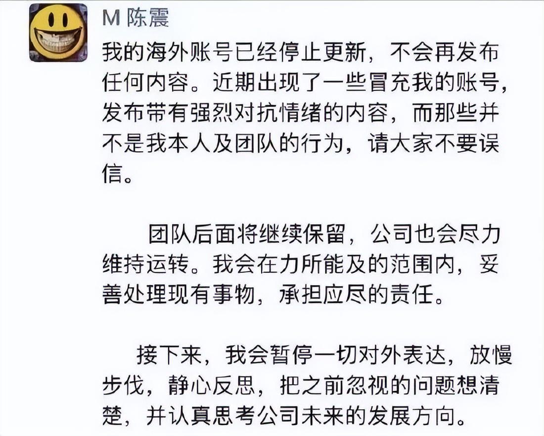 在曝出上述消息后,陈震在12月7日在个人朋友圈发文表示,其海外社交媒体账号已停止更新,后续不再发布任何内容,并澄清近期一些带有强烈对抗情绪的言论系冒充账号所为,非本人及团队行为。他表示将暂停一切对外表达,放慢步伐进行反思,认真思考公司未来发展方向。同时,团队将继续保留,公司会尽力维持运转,他将在力所能及范围内妥善处理现有事务并承担应有责任。