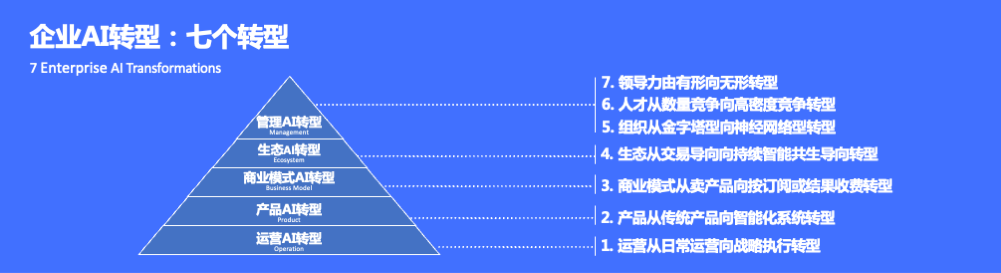 企业AI转型的七大路径,可分为两类:前四项(运营、产品、商业模式、生态)属于业务转型,后三项(组织、人才、领导力)属于管理转型。业务转型的成功,离不开管理转型的坚实支撑,二者相辅相成、缺一不可。