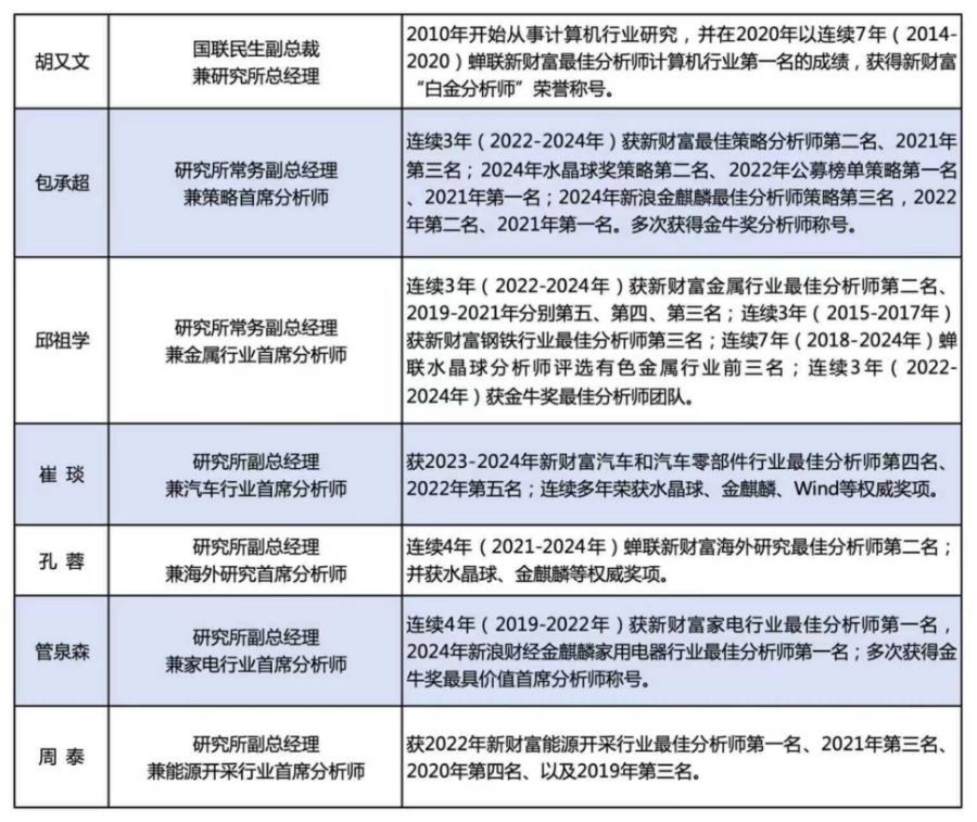 具体来看:胡又文担任国联民生副总裁兼研究所总经理;包承超担任研究所常务副总经理兼策略首席分析师;邱祖学担任研究所常务副总经理兼金属行业首席分析师;崔琰担任研究所副总经理兼汽车行业首席分析师;孔蓉担任研究所副总经理兼海外研究首席分析师;管泉森担任研究所副总经理兼家电行业首席分析师;周泰担任研究所副总经理兼能源开采行业首席分析师;陶川担任国联民生首席经济学家兼宏观首席分析师。