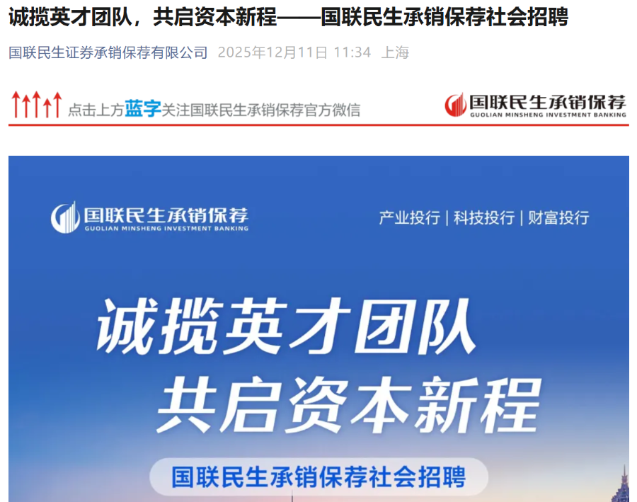 12月11日,国联民生承销保荐发布一则社会招聘,号称“诚揽英才团队,共启资本新程”,引发投行圈广泛关注。据悉,这是国联民生证券投行业务整合完成后首次大规模社招。