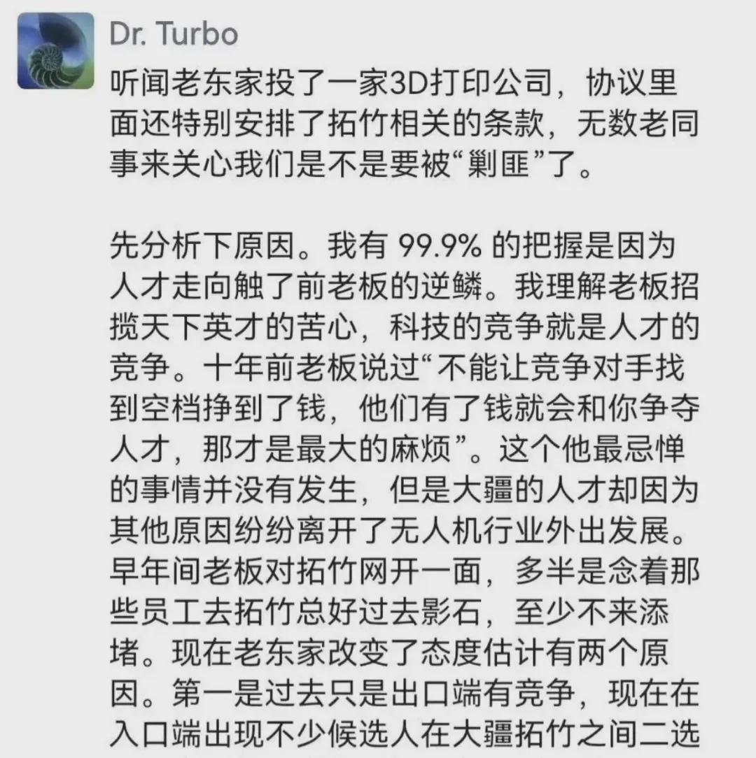 表示,“听闻老东家投了一家3D打印公司,协议里面还特别安排了拓竹相关的条款,无数老同事来关心我们是不是要被“剿匪”了。”