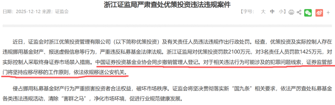 公司层面,优策投资被处以2100万元罚款并撤销管理人登记;