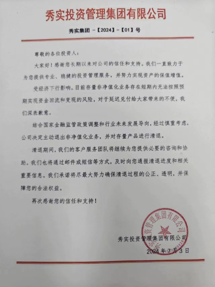 界面新闻披露,早在2024年7月3日,秀实集团已在内部发布延迟兑付公告,称将“主动退出非净值化业务,并对存量产品进行清退”。