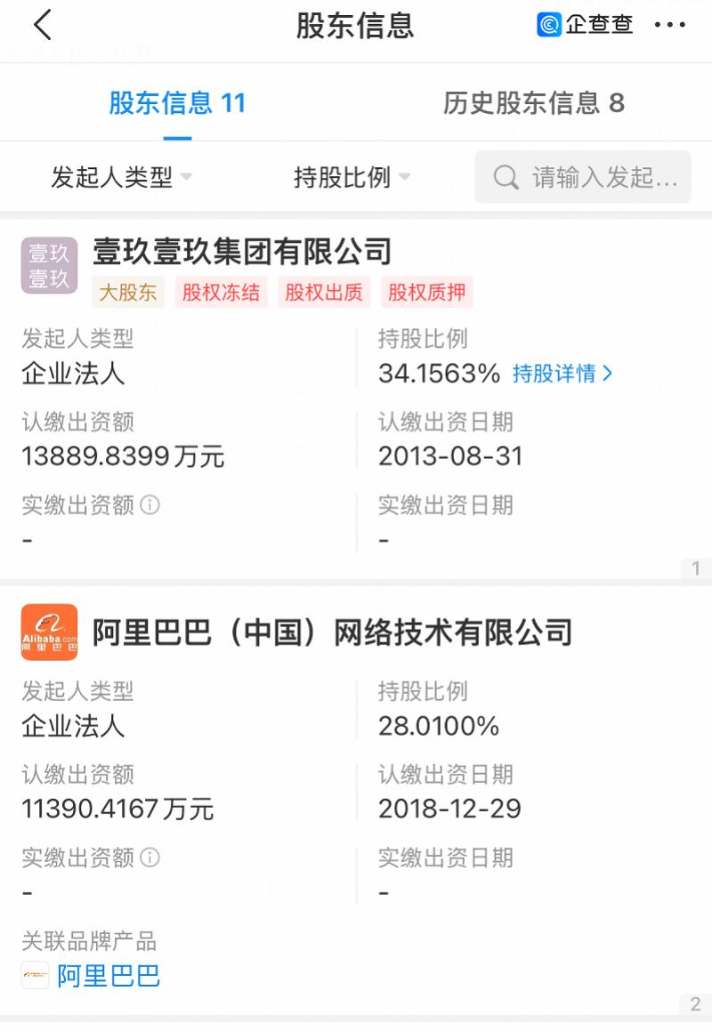 企查查显示,阿里巴巴(中国)网络技术有限公司是壹玖壹玖酒类平台科技股份有限公司的二股东,持股比例28.01%,认缴出资额1.14亿元。