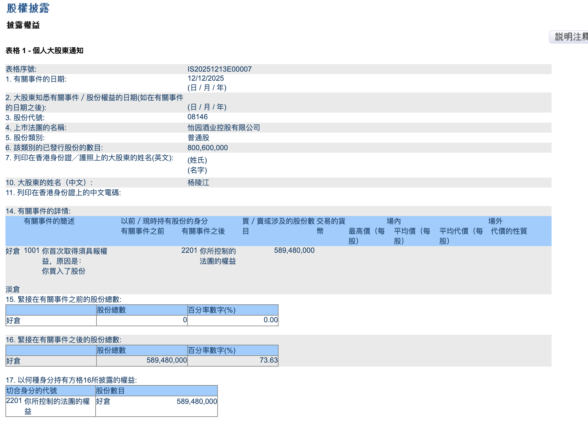 12月15日,南都湾财社记者从港交所官网获悉,杨陵江成为怡园酒业(08146.HK)大股东,持股比例达73.63%。在此次股权变更前,公司大股东为Macmillan Equity Limited。