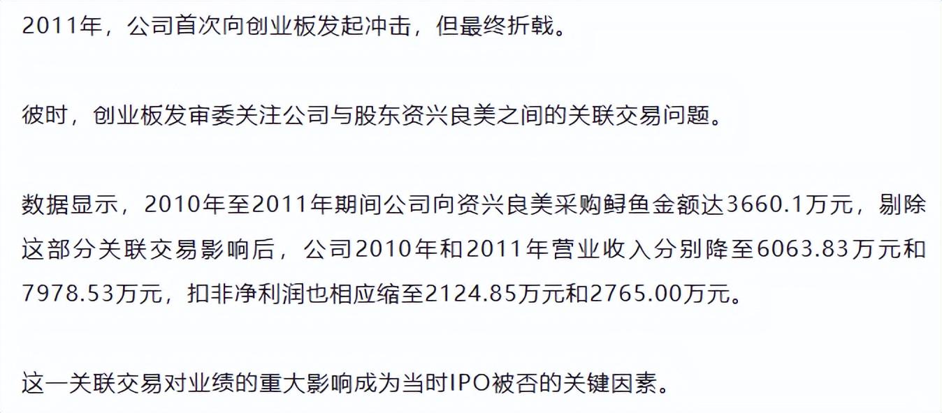 据《豹速科技财经》等整理,鲟龙科技首次冲击创业板发生在2011年10月,彼时其与股东资兴良美的关联交易成为致命伤。此举严重削弱了鲟龙科技业绩的独立性与真实性,首次冲关遂告失败。