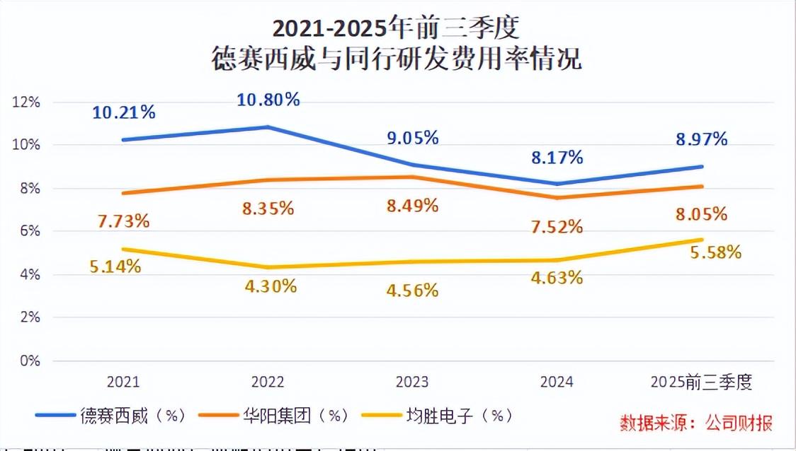 2021-2024年,德赛西威的全年研发费用从9.77亿元增至22.56亿元,研发费用率一直保持在10%左右的高水平,远超同行华阳集团(7%左右)、均胜电子(5%左右)等。