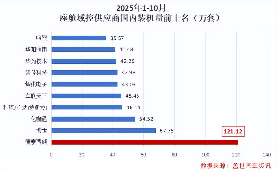 2025年1-10月,我国汽车座舱域控供应商中,德赛西威凭借121.12万套的装机量,成功登顶榜首,市占率约为16%,领先第二名博世7个百分点。