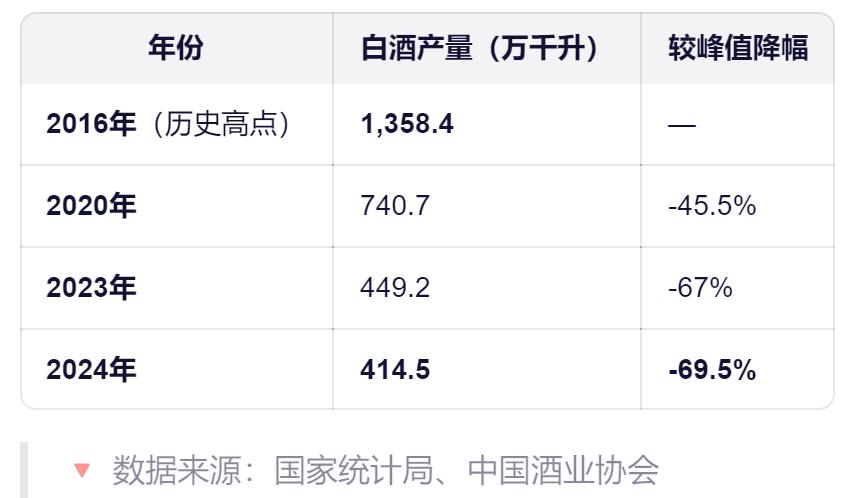 整体来看,中国白酒市场产量已连续多年下滑,其产量在2016年达到历史最高点,随后一路下滑,到2020年已经由2016年的1358.4万千升降至740.7万千升,跌幅达45.5%。这一趋势在2023年和2024年加速下滑,2023年全国产量为449.2万千升,2024年再跌至414.5万千升,较巅峰值时已经下跌了七成。不到十年,中国白酒产量缩水近七成,相当于从“每人每年喝20斤”降至“6斤”。这不仅是周期性调整,更是人口结构、消费观念、政策环境与经济周期多重因素共振下的结构性衰退。