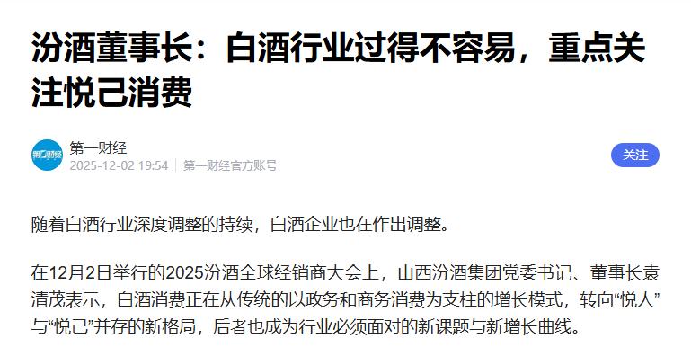据第一财经12月2日报道,山西汾酒集团党委书记、董事长袁清茂表示,白酒消费正在从传统的以政务和商务消费为支柱的增长模式,转向“悦人”与“悦己”并存的新格局,后者也成为行业必须面对的新课题与新增长曲线。相较于行业中一些白酒巨头还在坚持走高端路线,袁清茂可以说给白酒行业“上了一课”。
