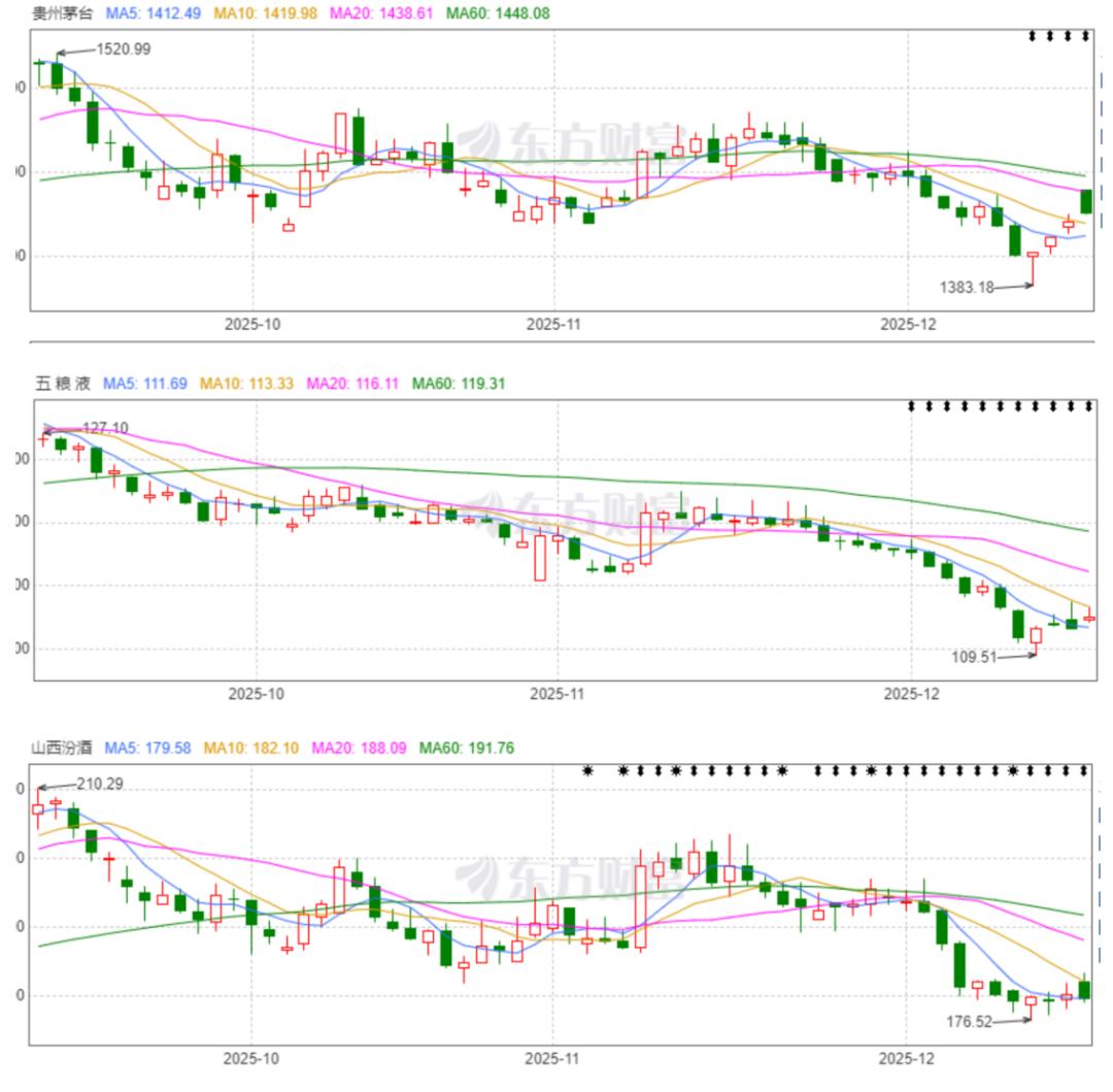 随着几个白酒巨头不同的消息释出,三大白酒巨头股价都出现较大波动。茅台在2024年12月31日收盘价为1524元,截至12月15日股价为1426元,年内跌幅为6.4%。同期五粮液股价跌幅达19.70%。汾酒同期股价跌幅为2.53%,汾酒成为股价跌幅最小的一家,抗跌性更强。茅台、五粮液和汾酒的最新市值为1.786万亿元、4365亿元和2191亿元。从市盈率上看,茅台龙头企业规模明显,以19.86的市盈率稳居第一,汾酒18.01紧随其后,五粮液市盈率为15.35。