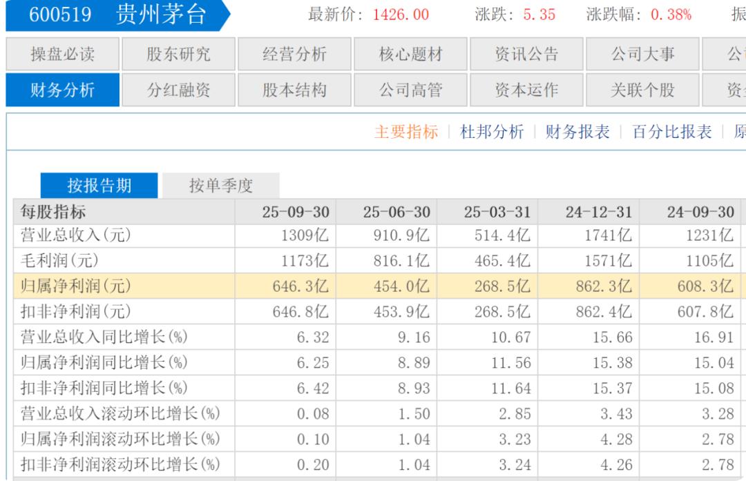 其中茅台前三季度营收1309亿元,同比增长6.32%;净利润646.3亿元,同比增长6.25%。这两项增速相比去年同期的16.91%和15.04%均出现大幅下滑。第三季度,茅台营收398.1亿元,同比增长0.35%;净利润192.2亿元,同比增长0.48%,自茅台上市以来首次出现营收和净利润增速跌破1%的局面。去年同期两项增速分别是15.56%和13.23%。