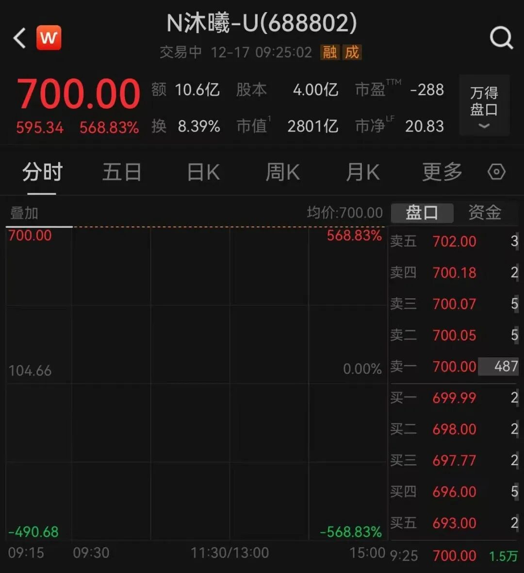 12月17日,沐曦股份竞价高开568%,股价报700元,总市值超2800亿元,以开盘价计算,中一签赚29.77万元。