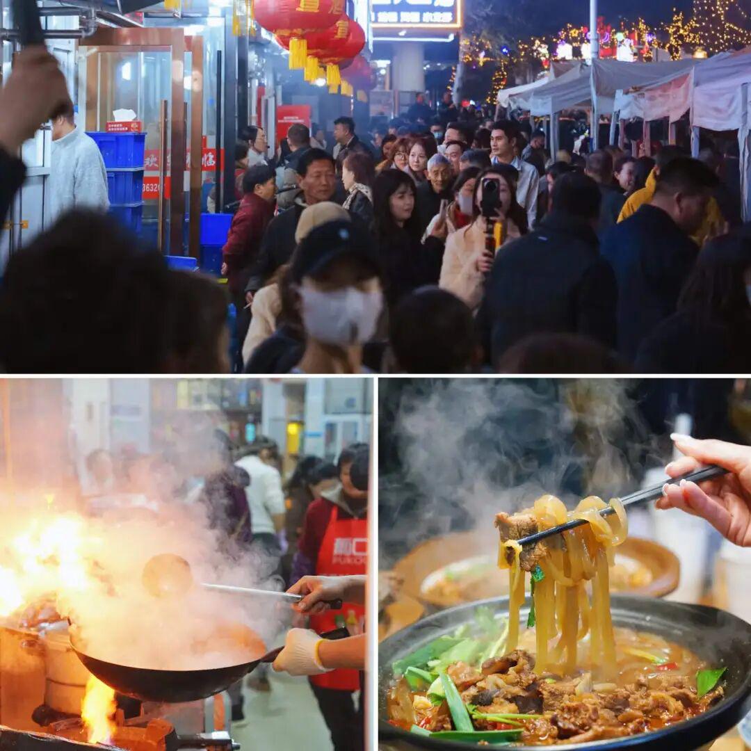 迎春街、绥安路两个街道的客流量最为火爆,外地牌照车辆挤满了县城停车场,卡旺卡取餐排到四位数,詹记桃酥刚出炉就被抢光,炖锅大排档天天热闹的像过年。