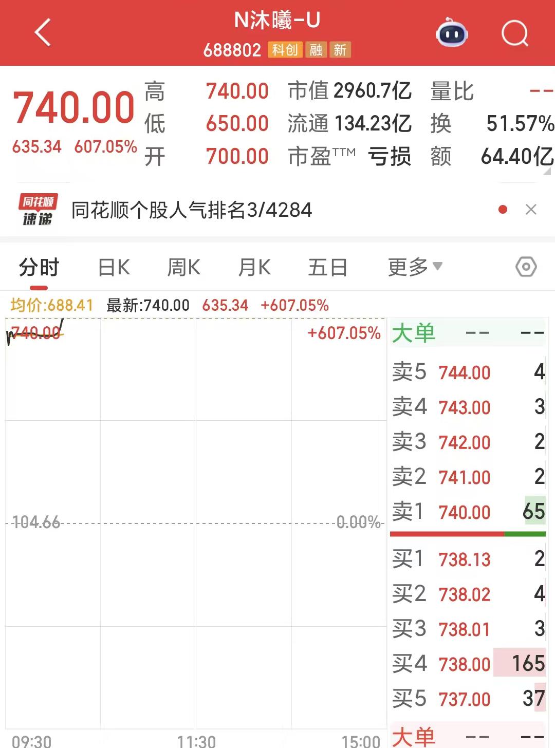 12月17日,头顶“国产GPU第二股”“年内第二贵新股”光环,成立仅五年的沐曦股份上市首日即高开568.83%,开盘价涨到700元/股。盘中一度涨到740元/股,涨幅达到607.05%,市值达到2960.7亿元。因此也登上了同花顺人气排行榜Top3.